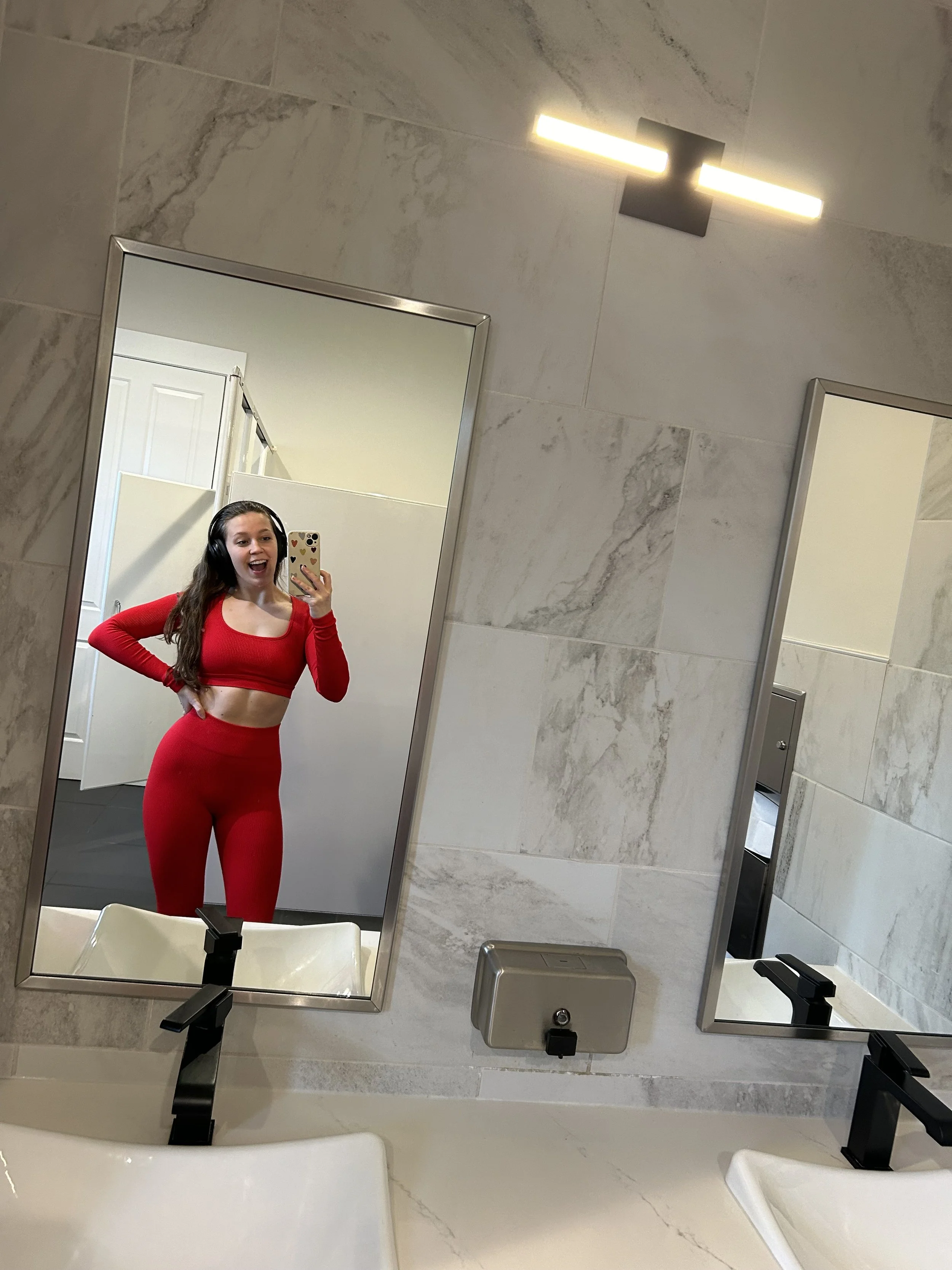 This is my favorite long-sleeve workout set, perfect for when it’s cold outside but you still want to look cute for your workout! This one is squat proof an very flexible. Comes in lots of color options!